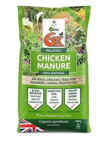 Since 6X Natural Fertiliser is six times richer than farmyard manure, it provides balanced nutrition for shrubs, flower beds, vegetables and lawns and is extraordinarily economical – one 15Kg sack of fibrous 6X Natural Fertiliser is sufficient to cover 180sq metres at lawn rate.