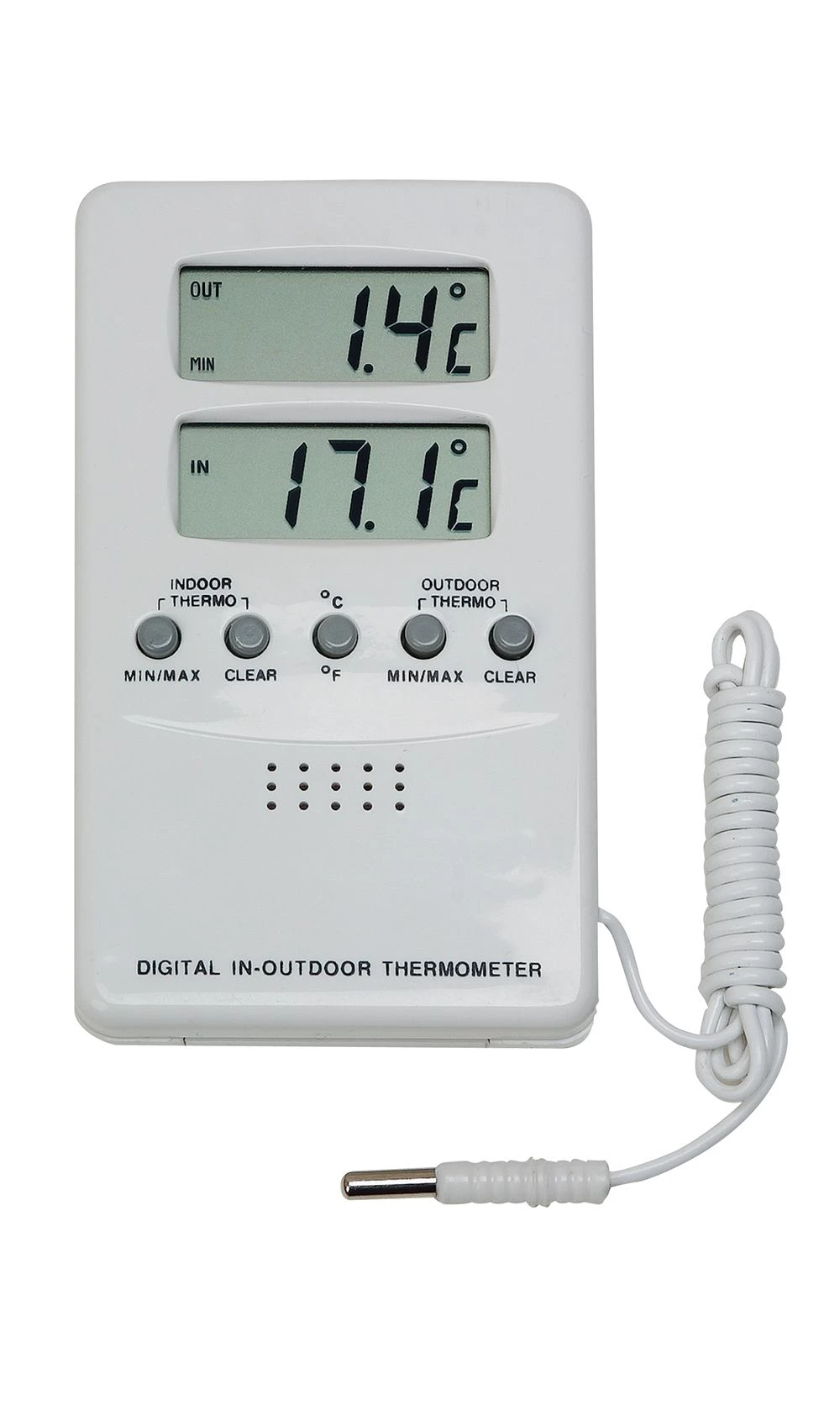 Digital maximum / minimum thermometer with external probe for indoor and outdoor use.