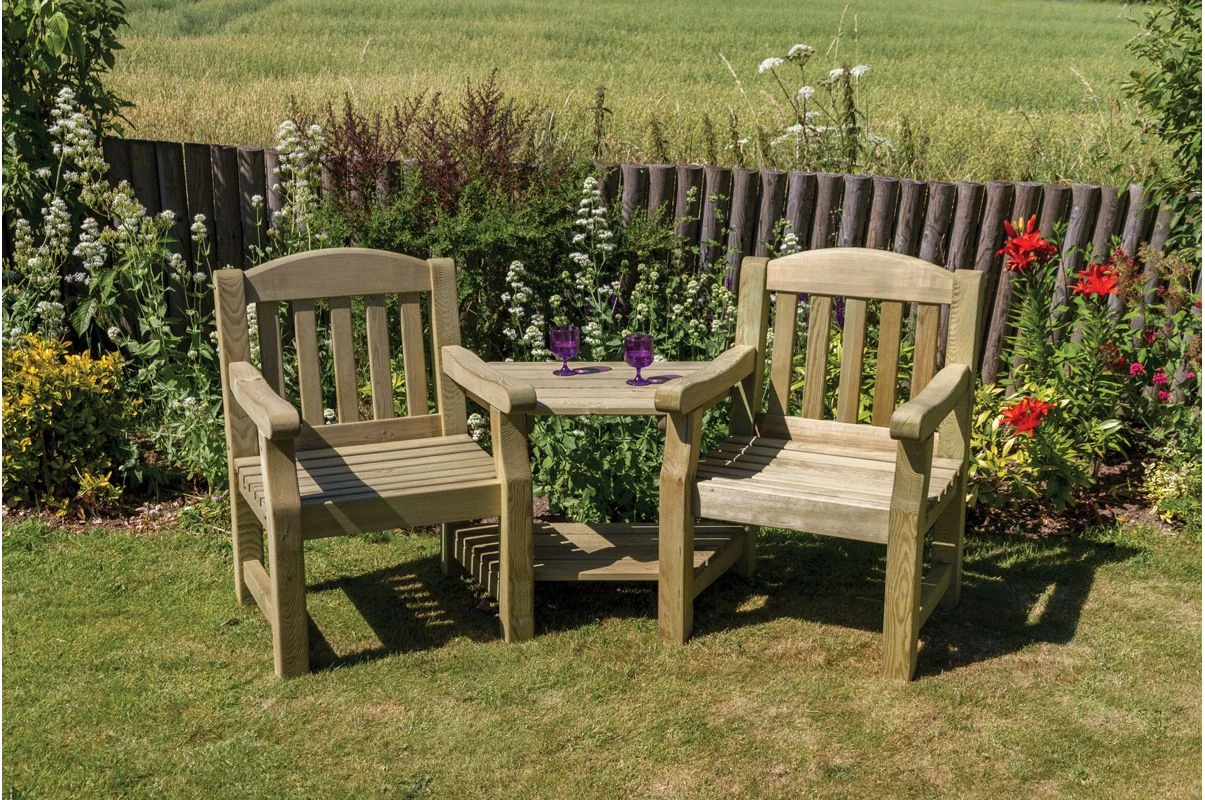A romantic piece of garden furniture, designed with couples in mind. The Emily Love Seat has two chairs angled slightly towards one another, with a small table between the two. Use for a romantic evening with your significant other or delight in your family or friends company.