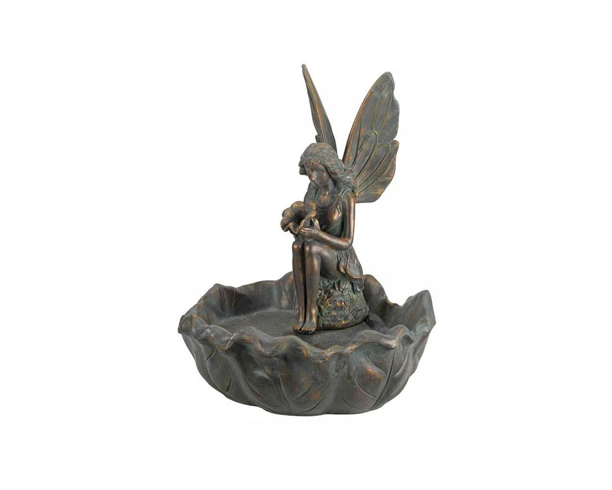 The Smart Garden Fairy Leaf Solar Fountain is a solar water feature that looks great anywhere. This decorative solar-powered fairy statue fountain operates using a separately supplied solar panel. A low-voltage pump pushes water through the flower held by the fairy. Water gently cascades from the flower, creating relaxing ripples and water sounds in the leaf reservoir.