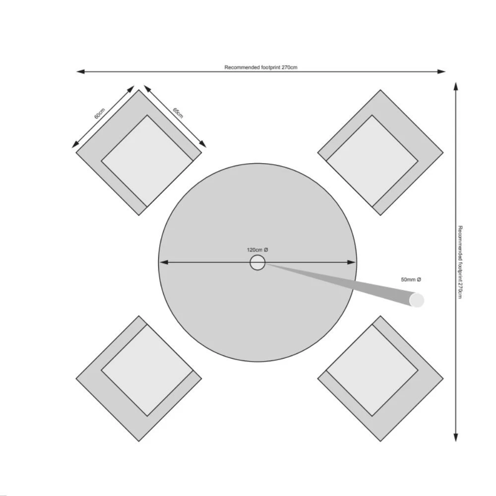 - Table: Width 120cm x Depth 120cm x Height 75cm. 1.2mm thick aluminium frame with rattan, 5mm thick clear tempered glass on table top with umbrella hole.