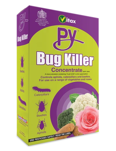 PY Bug Killer Concentrate is a broad spectrum insecticide which specifically controls aphids and caterpillars on roses and a range of vegetables.